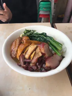 粮尾时份又到。每逢银根短缺之际,若碰巧当天没有带饭回办公室的话,小弟总会跑到这里,安坐于摆放在街头的櫈子上,吃一碗足料的烧味饭....下单后例牌送上例汤。汤内满是精肉、花生以及鸡脚蛮足料。味道颇自然绝无任何额外添加的人工味,可以放心地喝尽一大碗也没有问题....依旧点了上趟吃过的烧肉鸭饭。烧肉皮看上去有不少泡泡在上应颇对路但吃下去却是已软淰变韧了,相信在出炉时吃应会不俗;鸭肉相当厚身而不过韧硬,件件都是切自腩位的。啖啖肉自然食得甚过瘾....米饭煑得有点过硬,个人是不太喜欢....但这样的一大碗饭加上汤,吃得饱饱的还只花不到四十大洋,当然就不能有甚么可以抱怨啦....查看更多