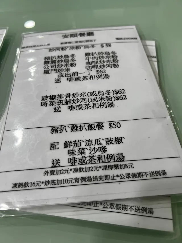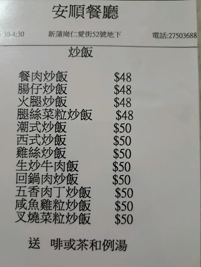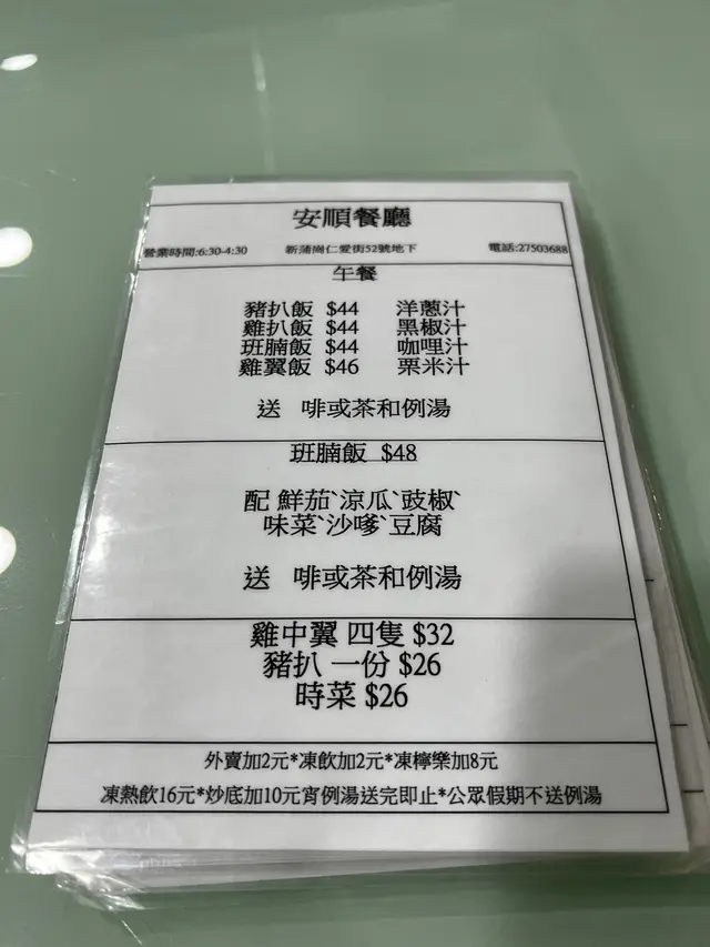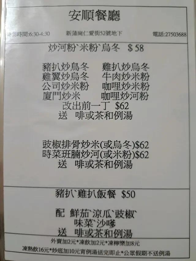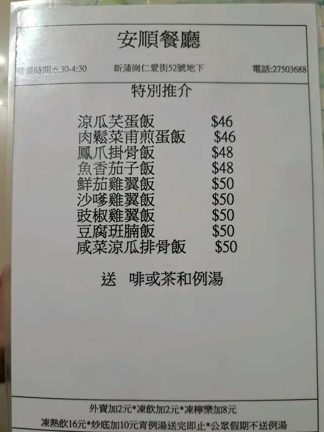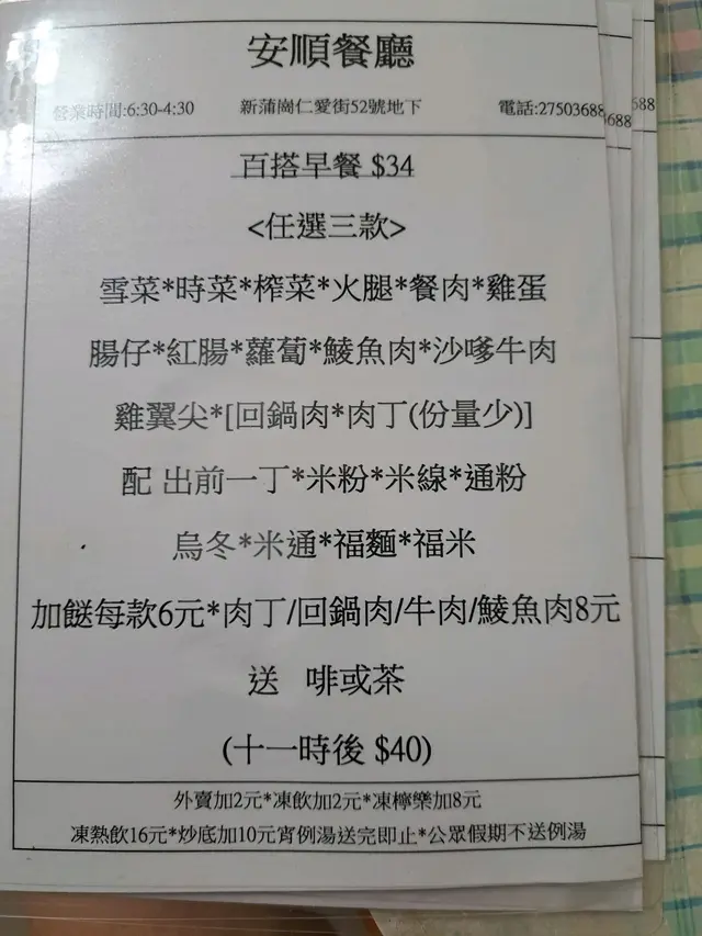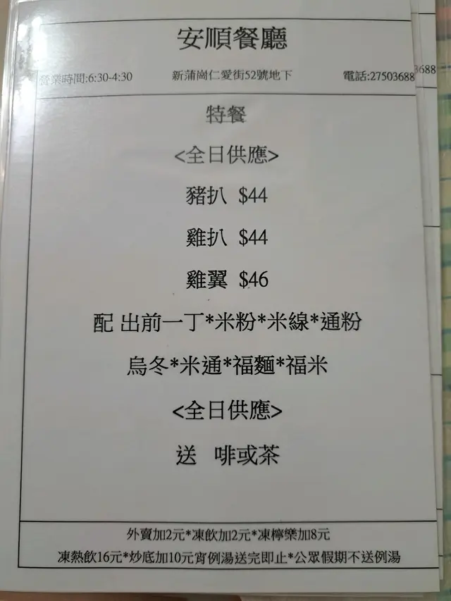 安順餐廳 (新蒲岗) 网址: https://s.openrice.com/QrLS0VumB00 地址: 香港新蒲崗仁愛街52號地舖 电话: +852 27503688