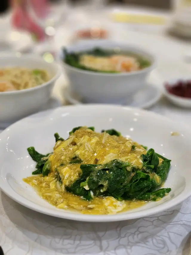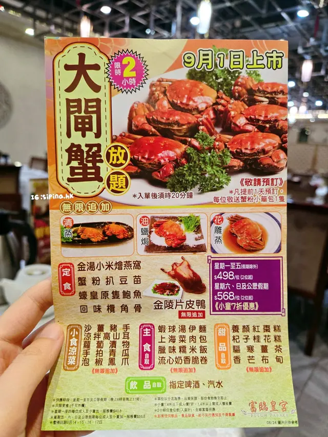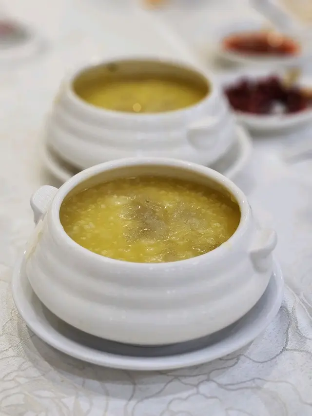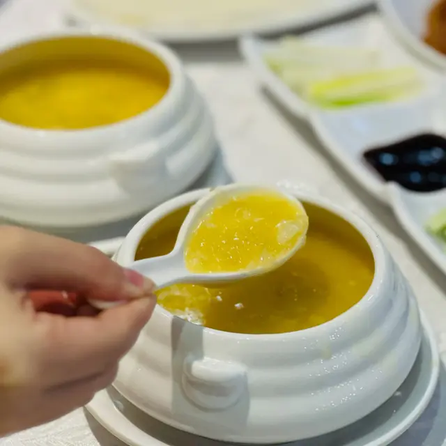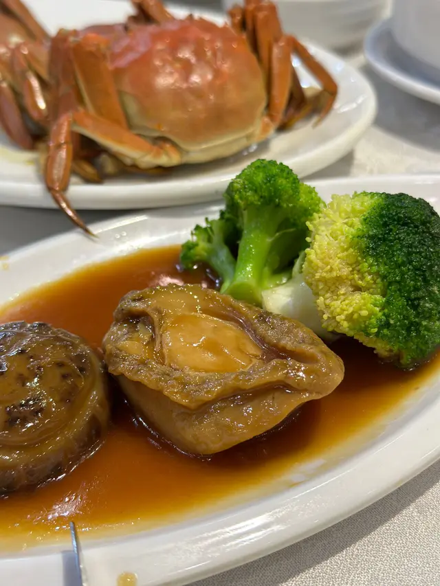 富臨酒家任食大閘蟹每人一份金湯燴燕窩、蟹粉扒豆苗、蠔皇鮑魚圖。一落單就有。行完鯉魚門,準備食晚餐,就見到呢間店舖2小時的大閘蟹放題。好吸引我哋呢種超喜歡食海鮮的人。除左金湯小米燴燕窩、蟹粉扒豆苗、蠔皇原隻鮑魚和回味欖角骨(只限定每人一份),其他都可以任食任飲。鮑魚軟硬適中,燕窩加入左些小米。我朋友覺得甜,而我則覺得咸。我們還點了片皮鴨,鴨皮脆口。大閘蟹有三款味道,分別是清蒸、油鹽焗和花雕蒸,我個人比較喜歡清蒸的大閘蟹,最是原汁原味;油鹽焗較咸香;而花雕蒸則有一陣陣酒香味。食完性寒的大閘蟹,當然要配上一壺薑茶驅寒和一碗糯米飯,糯米飯一碗的份量不是很多,所以不用擔心兩人食不完。.…查看更多