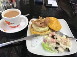 星期日啦 想簡單鬆一鬆 每個人方式都唔同 而我同老公 就係食啦小店座落小茄子、倫哥等附近 茶餐廳式經營吧 而重點是其鎮店菠蘿堡呢跟餐熱檸水 正常茶餐廳水平啦芝士豬柳蛋菠蘿堡餐配薯角 $50 OK薯角混著薯條 夠熱夠脆 但略嫌不夠鹽漢堡另加了芝士 好香 豬柳夠嫩滑 但菠蘿包不夠酥脆 略扣了分數再來個近距離看看芝士咸牛肉炒蛋菠蘿堡配薯角 $50 普通咸牛肉配上芝士絕對係最佳搭配 加上沙律醬感覺惹味 但 味道上同菠蘿包不太夾⋯豬柳那款相對吸引 總體黎講 都係可以一試既下午茶之地下次會來試試招牌菠蘿堡睇睇有無更佳表現:)查看更多