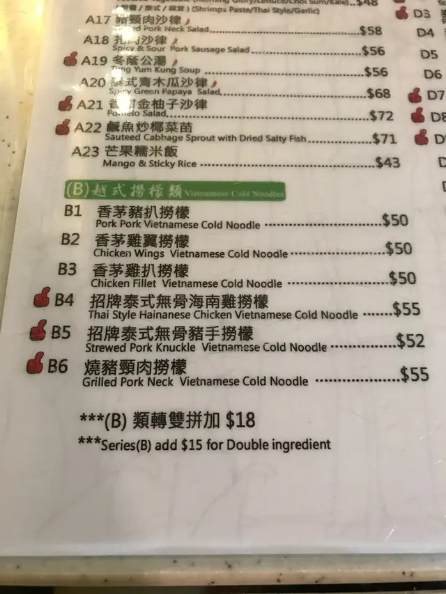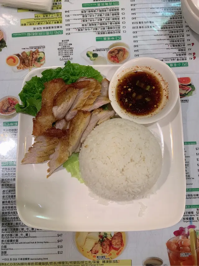 呢間泰國菜我都已經去過起碼超過五次,原因係因為我屋企係附近,食過咁多次都覺得價錢上好抵食!加上平日去,都唔洗排隊😆椰青/珍多冰🥤 跟飯+$20/$10跟飯嘅話好抵飲☺️招牌無骨海南雞飯🍚 $52我覺得唯一不足嘅就係佢話無骨,但係其實都有少量嘅骨,不過個汁好好味👍🏻燒豬頸肉配飯🍚 47味道其實都唔錯,只不過唯一美中不足嘅就係啲邊位燒得太硬,但中間肉個d位就幾好味,個汁撈埋落啲飯都食會無咁乾好食好多😜泰式炸蝦餅拼春卷 🍤 $44呢個配搭我真係覺得好好,因為當唔係咁多人一齊食嘅時候,但係兩樣野都想食嘅話,就可以叫呢個雙拼一次過品嘗到兩種食物,而且都好好味,蝦餅好彈牙,春卷就好足料😋串燒沙嗲🍢今次得三個人,所以淨係帶咗三串,豬牛雞各一串,沙嗲醬好正🤤🤤 我覺得牛肉個串最好食。芒果糯米飯🥭上到枱嘅時候熱熱地,啲椰汁都幾多下,而且佢係兩溝!黑糯米再加普通糯米,值得一讚,味道方面都幾好,芒果都好甜。餐牌📜查看更多