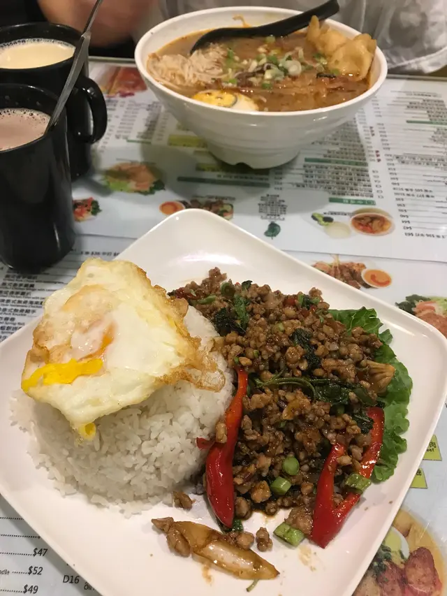 夜晚屋企唔煮飯,梗係去搵野食醫肚,深水埗雖然多野食,但大部分都食晒,又唔想太貴,突然醒起有間抵食泰國菜好耐無食,就決定同屋企人一齊去食💪🏽來到小泰豆,就算夜晚都只係大概50-60一個餐,包野飲,質素都幾好,又係抵食之選👍🏻必食推介就係呢個泰式辣椒炒肉碎煎蛋飯,基本上我每次來食都係叫佢,最緊要係肉碎同個汁好夾,辣辣地好野味,不過我就唔中意太多香草,會逐條逐條夾返出來😂煎蛋都好靚,點綴左個飯不少。另外屋企人又叫左個喇沙金邊粉,不過佢就嫌個湯底唔夠香,都係嗰句,應該要加多啲椰奶令件事似返東南亞feel,呢個都係香港既各國餐廳通病,為左配合香港人口味有時候係忘記左嗰個國家菜既特色,係要改善下。菜呢啲都係例牌,營養均衡必選,只需$20一碟!臨走嗰陣見到成枱泰國人樣既人響到開餐,可能都幾岩佢地口味😂小店加油💪🏽查看更多