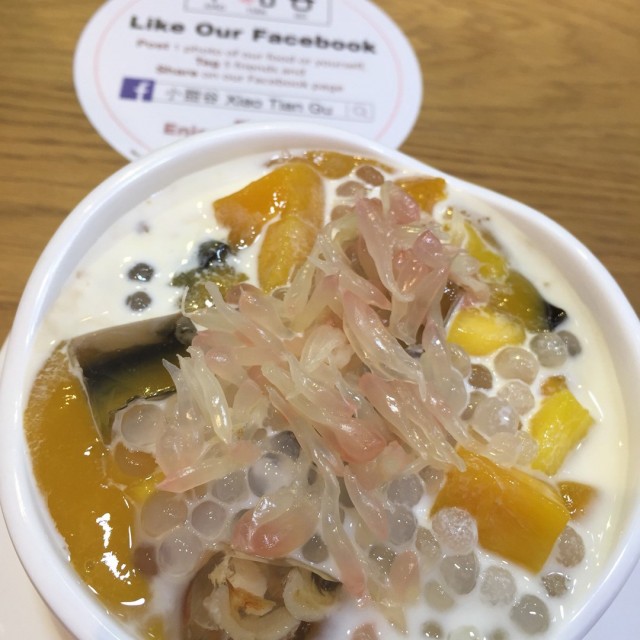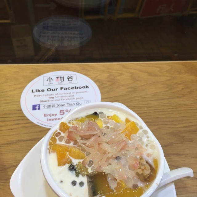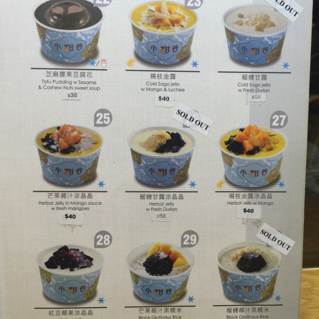 食完饭,去找甜甜吃!得知谷祖琳开店很久,这是第一次去吃,满满的期望呀!门口张贴著post and share可以有5%折扣~室内环境光猛,墙壁张贴著海量的明星照片,打开menu正想找寻榴连甜品的迹影,竟然!全部Sold Out !!!唔止榴连,就连好多想拣嘅都冇!呜~唔制呀妈咪~如果我自己一个人黎,分分钟真系会出番去~芒果椰汁黑糯米黑糯米超多,太杰,味道可以,芒果肉香甜,好似食饭仔甘,好饱叫职员拎杯水冲冲口,可惜没水提供最后叫职员俾左d椰汁加入去,不过帮助唔大芝麻杏仁糊Menu上的图案明明是两个芝麻糊拉花,可惜卖相有点差异,大家睇到捧腹大笑!味道不错,糊质幼滑,稀杰适中芒果椰汁亮晶晶亮晶晶那透明的东东味道同口感好好可惜椰汁比较少,太杰,凉粉冇乜味,芒果足料香甜~杏汁木瓜雪耳杏汁味超香,一放下枱就闻到,木瓜雪耳足料,唯独是糖水不够浓~姜汁芝麻汤圆 (制作比较耐)汤圆皮薄饀靓,姜汁味道浓,$38有8粒汤圆,都算几抵食!P.s: 食完好快走的2大原因:1.有人开始出面等位2.张椅嘅形状同硬度坐到pat pat 痛,坐到唔想坐!想倾下计坐下唔算系好选择!…查看更多