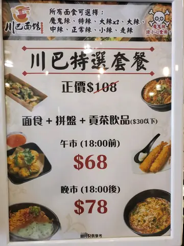喺旺角返工已经发掘到好多平食,呢日心思思想食辣嘢,又揾到一间价钱唔贵嘅四川嘢🌶系食酸辣粉/担担面𠮶啲🍜而呢间川巴面馆就系喺西洋菜南街街尾(姐系近住家乐坊),𠮶边有间楼上舖嘅贡茶🍹,而🌶面馆就系贡茶同一个位啦!👇🏻直入大厦会见到佢地嘅招牌餐厅比想像中阔落,👆🏻而且仲有啲位好啱女仔打卡😹😹😹其他座位基本上都系中式嘅木台木凳👇🏻台与台之间亦唔会太近👍🏻👆🏻餐厅墙上面、每张台都有餐牌👇🏻有酸辣粉、担担面、乌冬、薯粉等等,每碗面都只系28蚊到38蚊不等👍🏻平食碗面当lunch都唔错架~另外亦可以加配料、小食🍢不过比我发现到原来有套餐!😹仲相对抵好多!因为一碗面+小食+嘢饮($30或以下)都系68蚊,如果每样嘢散叫,加埋就超过100蚊啦😹所以套餐一定抵食好多~👇🏻贡茶餐牌我地三个人就叫咗三个餐👍🏻我呢个系土鸡丝担担乌冬(中辣)🤔👇🏻明明开舖无耐,店员话面卖晒,所以改乌冬🤔担担乌冬就无咁夹啰,不过佢个味系做得几好,食到有啲花生味几香,中辣黎讲唔算好辣🤔鸡丝就正正常常~呢个价钱系几好架啦~👇🏻三个小食份量都算多(右上)巴蜀手撕鸡🐔类似我碗啲土鸡丝咁,呢个有啲辣酱、芫茜等等,所以食落几香,鸡肉亦唔鞋口(右中)红油抄手🥣有九粒~唔太辣,抄手都大粒,皮薄肉多!(右下)小食拼盘🍢纯粹见佢最贵所以先拣(单叫$46)😹无咩特别,都系炸嘢😹有条虾、蚝、春卷等等(左)朋友食嘅酸辣粉(中辣)话几惹味~而嘢饮就包咗30蚊或以下,多咗补返钱~呢杯荔枝乌龙啱啱好30蚊😆都有淡淡嘅茶味~查看更多