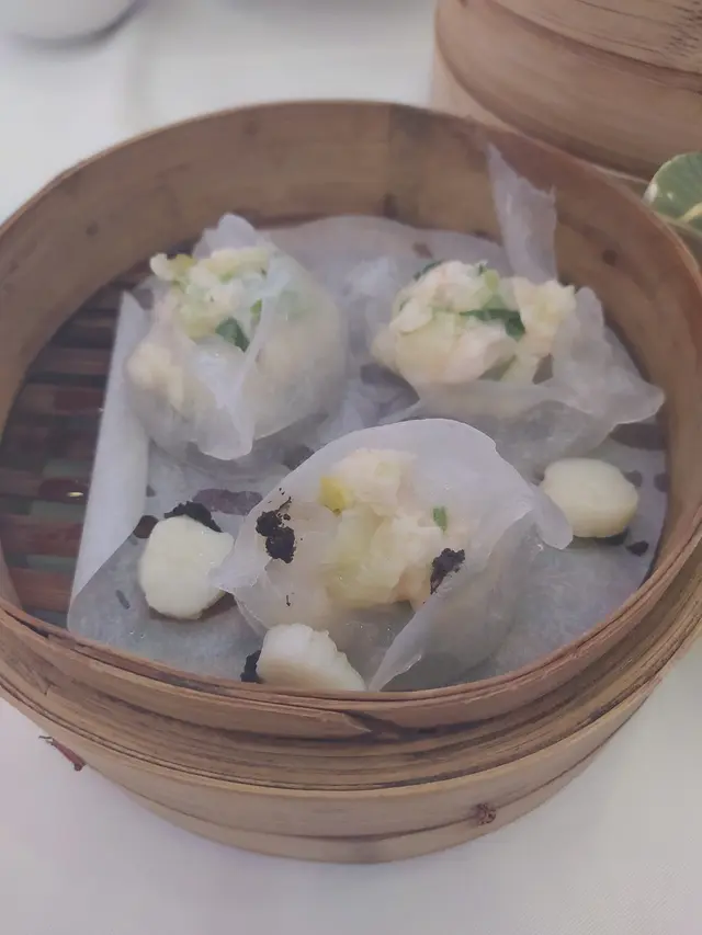 Steamed scallop dumplings with black truffle