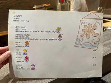 日本天然水雪花刨冰 / 彩羽太卷 / 备长炭烧黑鯥 / 烟熏鲣鱼 / 𩽾𩾌鱼肝泡芙