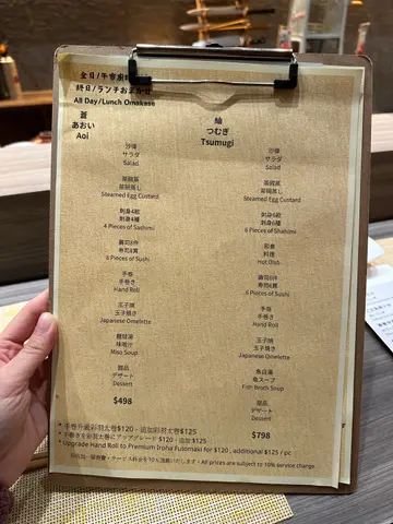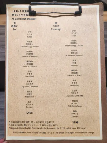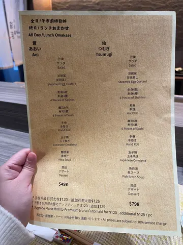 唔系特别日子都唔会谂起想食omakase,因为系香港嘅日本餐厅,最平嘅omakase set动轧都索价近千元,未必敢随便大快朵颐🥹但原来湾仔有间日式餐厅竟然有逆市价$498嘅Omakase set😱🤑🤑有齐刺身、生蚝、寿司、卷物等等,仲可以加钱升级做浮夸又高质嘅海胆拖罗太卷,完成度好高🤪价格却似打咗大大折扣。不论午市或晚市均有供应,值得专程支持,无需等特别日子都可以嚟好好享受一下,犒赏自己🥰苍 Aoi Omakase $498🥗沙律🥚茶碗蒸茶碗蒸好滑,上面有鱿鱼几特别。🦪刺身4款真鲷、大分县真蚝、烟熏鲣鱼、𩽾康鱼肝泡芙4款各有特色,presentation都好有心思❤️真鲷清新淡雅,真蚝则鲜味爽滑😋再来浓味一点嘅鲣鱼,食之前喷上烟熏泡沫,一路望住泡沫慢慢化成烟🌪️既具视觉效果,亦具烟熏香气😍最后有看似甜品嘅𩽾康鱼肝泡芙,泡芙微甜脆口,咬落爆出浓浓甘香嘅鱼肝,齿颊留香😋🍣寿司8件鱿鱼、深海池鱼、比目鱼、濑尿虾、中拖、鲽鱼裙边、贝柱、海胆寿司环节同样惊喜连连🤩深海池鱼一贯以浓郁鱼味抢占一席位,而中拖则以柔软无比、入口几近即化嘅口感为口腔按摩☺️鲽鱼裙边经火炙🔥鱼油香亦教人深刻。最后以软滑海胆军舰作结,浓浓嘅海胆甘甜味正好为呢场寿司大战划上令人满足嘅句号🥳🍣手卷升级彩羽太卷 $120一波未平一波又起,师傅端来以大堆高质食材作招徕嘅彩羽太卷,就如敌军毫不留情地投下原子弹一样,震慑全场😎薄薄嘅寿司饭卷著海胆、拖罗、腌渍蛋黄、青瓜等,各种食材争相系口腔欲占一席位。各自看似毫不相干,但呈溏心状嘅蛋黄正好发挥润滑作用,一举将各种食材融为一体😋所以最后并无边一种抢去风头,只有尝味之人一人独胜😛🍮玉子烧、面豉汤🍧甜品升级士多啤梨日式刨冰 $120食完寿司一般会以雪糕作结,但餐厅花点巧思,专程喺席后放上一部日式刨冰机🧊于整顿饭一直慑住食客眼球,直到忍唔住要将甜品升级做刨冰,将色香味享受升华🤣师傅毫不犹疑捧来一大旧冰砖,起势地刨,三两下已经将冰砖刨成幼细嘅冰粉❄️上菜前再淋上士多啤梨果酱、奶盖及士多啤梨,日式风情油然而生。旁边两位美女忍不住拍照留念,但为养生只能不顾口腹之欲,见证住我毫不留情地将刨冰吃清光🤪🍱香葱伴吞拿鱼腩蓉丼 $98除咗Omakase,餐厅其他丼饭、定食定价亦极为亲民🤑份量十足,为附近上班一族提供美味慰藉❤️🩹吞拿鱼腩蓉软滑鲜甜,质素不比前几道寿司逊色。除咗吞拿鱼蓉丼,其他如三文鱼亲子丼、汁烧牛肉丼、黑豚五花腩丼等亦为不错选择👍🏻推介指数(10分为满分):8分