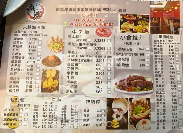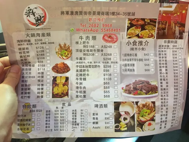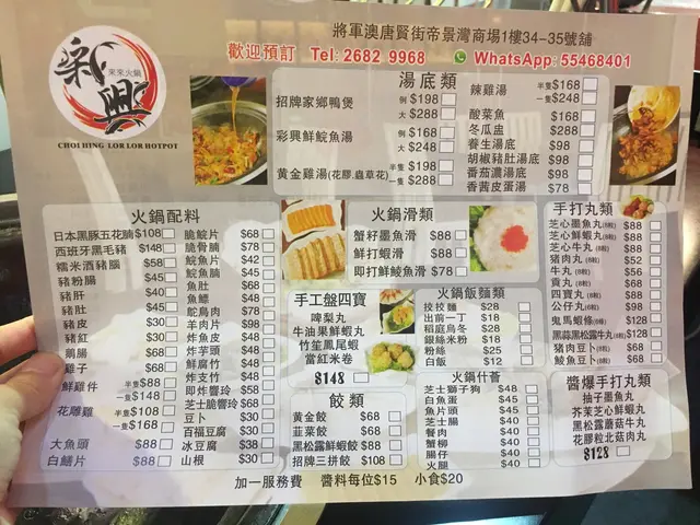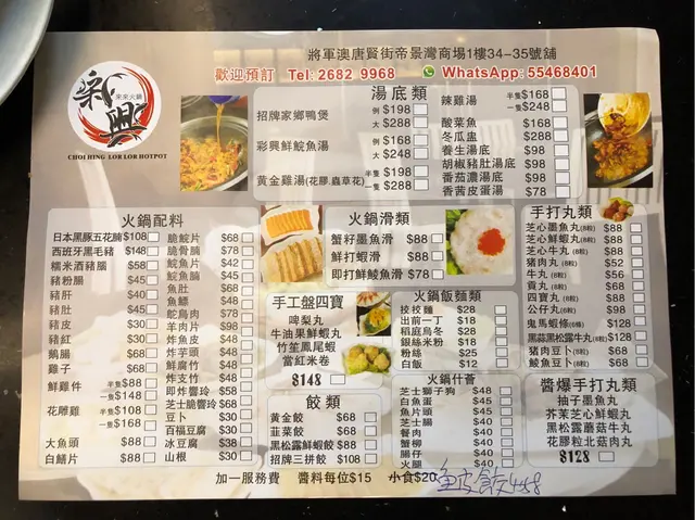 Choi Hing is located at Corinthia By The Sea which is a real bugger to get to.There is no connecting mall so you have to take main road to Chi Shin Street, cross that then go in the small alley which leads to Corinthia By The Sea.Luckily I was accompanying someone to get their SmartID done so I didn't deliberately come all the way here for this.Went here randomly for hotpot as the pots looked funny.The pots looked more like WOKS so therefore I call them wokpots!The menu was pretty standard so it just depends on the quality of the ingredients they use.Hotpots must be tasteless as sauces and condiments are annoying compulsory and charged when I don't really need it.Some of the items were creative for a hotpot with avocado items.- Avocado wasabi Beef-Prawn balls stuffed with avocadoThere are various of pots to choose from, if you choose fish that will be a bad mistake.The fish isn't that silky and the best thing is bones!For the hotpot, here were the items we had:The ostrich meat was damn good because it was tender like beef but without any cholesterol.If you order rice vermicelli, it ends up tasting like the Chinese braised vermicelli dish with duck.As for the hotpot, it gets saltier and saltier towards to end laced with fish bones.Definitely coming back again for a bonetastic experience!…查看更多