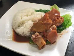 同朋友仔分开叫:)镇店双宝汤米粉 (牛腩、云呑)($39)一上枱劲大阵清汤腩嘅味道,有好多牛腩同两粒云呑!牛腩好香好有牛味,但云呑就普通啲,馅料多但无咩味!南乳鲜猪手饭($40)呢个朋友仔叫,有猪手有菜,感觉都ok,佢嘅食评系ok唔太咸!