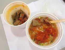 朋友说想吃德龙的潮州四宝,我也一起叫外卖了!打电话落单的时候才发现送外卖的叔叔没有上班(也不是第一次了),变相要自取~🤷🏻♀️↑蕃茄汤猪膶鲜牛肉米粉:外卖其实是汤另上的,这点真的很好(虽然也更不环保)。蕃茄汤带一点蕃茄肉,米粉很滑,这个很惊喜!猪膶切得比较厚,但煮得熟透而不韧。反而鲜牛肉比较参差,一块较韧,另一块肉质又较松,而且切得比较碎,但尚可接受。总的来说,还是一直在吃的牛三宝粉丝较好吃,质素也较平稳!