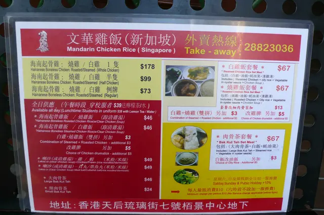 曾分別試過香港文華酒店與及新加坡文華酒店的海南雞飯,最喜歡還是新加坡的味道,由於年代久遠,不知現在的情況是否也如過往一樣。在天后碰上了一家文華雞飯 (新加坡),正門貼滿不少食評及報導。是否就是指新加坡的文華酒店,有點猶豫,不試便不知,還是拿出勇氣來試試,相信不要將全盤期望押注的話,即使情況是強差人意,也不會太失落。我們在門口查看了餐牌一會,決定好要選外賣的項目便內進。文華雞飯的店舖呈長方形,裝修以白色為主,予人整潔之感。近窗口處設有3人一排的卡座,其他均是由小方桌拼合的桌子,大概能容納32位食客。油飯是海南雞飯重要的一環,味道出色的油飯,那種滋味,往往不用海南雞也能吃上幾碗。就正如豬油撈飯一樣,不過雞油飯就矜貴多了。驟眼看,文華雞飯的油飯似乎乾了點。果然雞油油份不足,小時候外婆老是說我終日不願意喝水,十足乾蒸燒賣。長大後我才明白乾蒸燒賣其實不乾,反而在蒸的過程中肉質被水份潤濕了,現在我會用乾過禾稈草來形容。乾過禾稈草的雞油油飯,沒有金黃的色澤,一碰即散,入口枯乾,當然感受不到應有的芳香、軟糯油潤兼備的飯粒。儘管如此,雞油飯也不是差得一文不值,米飯經雞湯及香料烹煮後,兩者味道全滲進米飯內,味道豐厚,唯失手在油份方面,有待改善。白雞半隻,份量不算得少,剛好足夠兩人食用。從雞件的大小察看,所選用的雞隻應不算太大,正正如此,廚師更容易掌握雞隻的烹調技巧。雖然我習慣不吃雞皮,但在咬出雞皮時,也能感受得到雞皮的爽脆。而雞肉非常嫩滑細緻,就連雞胸肉的嫩滑程度,也與其他部位相差不遠,值得推介。要挑剔的話,就要算是雞味不怎麼的濃,這與香港人吃雞的習慣有關。三款醬料是吃海南雞飯不可或缺的,橙紅的是辣醬、黃色的是薑蓉和黑色的是甜豉油。或許新加坡天氣炎熱,需要濃味來刺激食慾,加上東南亞的雞隻多屬較瘦削的運動形,雞味較淡,三款醬汁可為雞肉提昇食味。三款醬料中甜豉油最不地道,首先是黏度不夠,既不能緊附雞件,也未能黏著其他兩款的醫料;再來是不甜,有損甜豉油的本質。而其餘兩款辣醬與薑蓉醬料則不過不失,當然也找不著驚喜。仍舊很懷念老公一位新加坡大學同學,他當時的女友是海南人,親自做出來的海南雞辣醬,充滿蒜香及混集不同香料的香氣,其時當然是珍而重之,直至今日也難以忘懷其滋味。除了上述三款醬料外,在雞件內附有另一包黑啡色的醬汁,試了一點,醬汁帶有不錯的滷水香氣與食味,但礙於不太肯定,也未曾嚐過海南雞飯中有這種醬汁,於是還是放棄了。在雞件下發現青瓜片,一直渴望能嚐到醃製過的酸甜青瓜,怎料只是生青瓜片而已。食客要在香港找一份色、香、味俱備,恰如其名的海南雞飯,好比老闆要找一位面面俱圓、稱職的員工一樣的難,事實如此,寧缺勿濫,這是個人吃的宗旨,不過作為老闆就頭痛多了。購買外賣時,在店內值班的只有一位女侍應,她的服務態度真令人詫異。先是不容許我拍照,我明白到國有國法,家有家規,拍照或許會影響到其他食客,也有其道理。但外賣備妥後,我們要求多加點醬料,她板著臉馬上回應不能太多,只能加一點點,然後將我們的外賣拿去補充醬料。其時我們給她的回應均嚇傻了眼,醬料全放桌上,難道會對堂食的食客規限醬料的用量嗎?再者,我們若不向她事先來過禮貌的招呼,而改為自行在桌上倒加醬料,她又能奈我們任何何嗎!!!怎樣好吃的出品,有這樣的女侍應也只會落到趕客的收場,一次也受夠了!遇上這樣的情況,老闆要怎樣抉擇才好。…查看更多