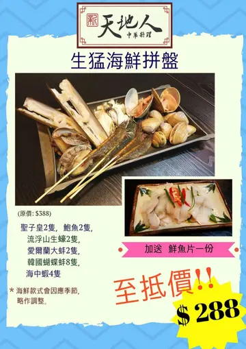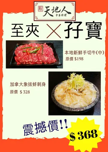 中秋节同家人book枱吃饭,家庭人数达20人,想慢慢食,吹下水,唔会催枱,又要食材新鲜,价钱合理的话,就真系要试试「新天地人中华料理」其实自己同朋友已帮衬过好几次,每次啲食材一到,都系忍唔住即渌,本身无相机食先呢个习惯的我,都系第一次写食评。因为今次爸爸妈妈都食得好满足!由于上次黎食见到餐牌有象拔蚌刺身,已想order试下,但原来无预早订系无得食!😅所以今次我预早一星期订定位,仲指明要食龙虾刺身同象拔蚌刺身!龙虾刺身同象拔蚌刺身非常新鲜,弹牙!但我唔知系我订得小定系咩?上碟后每人三几片已KO左只3斤几重既龙虾刺身,大家都唔太够喉!🤤🤤之后龙虾头再攞黎打边炉,完美配合!😍😍本身唔食牛的我,但其余19人都食牛,因此我地先order 左2碟试下掂唔掂先,到最后re-order 左2次,即系total食左6碟肥牛😨好唔好食应该不用多说了🤤🤤其他游水中虾,响铃鱼皮,饺类就唔多写了!仲有服务态度好好,未齐人比我地坐住等!食到咁上下要影相又主动黎帮手影!重有一样野好重要,就系门口泊到车!坐地铁又近!市区系边度揾?总之一定会再帮衬!