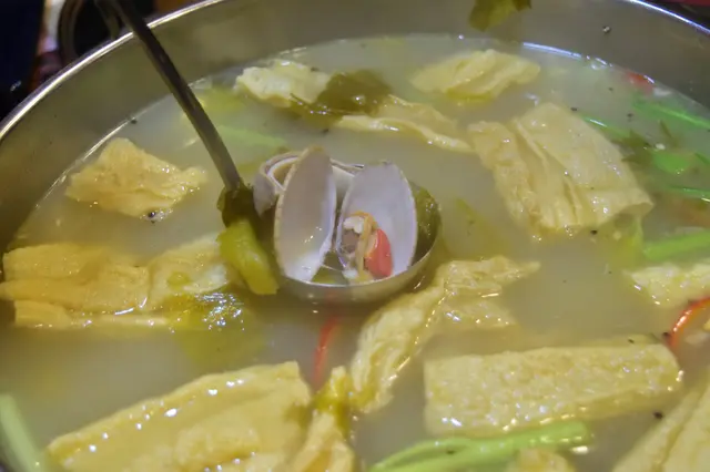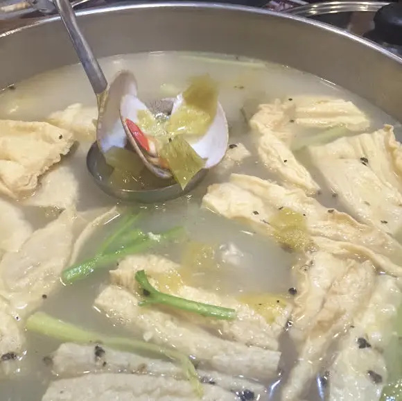 broth piled high with clams, pig stomach and pepper