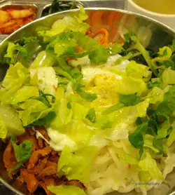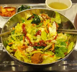 面头铺了一大堆生菜 萝卜丝 甘荀丝 牛肉 还有一只煎蛋还附上一支韩式酱汁此外 这个饭还附有两碟前菜分别是泡菜和菠菜还有一碗清汤前菜的质素不过不失反而清汤较有惊喜 颜色看起上来不太深入口却充满香浓肉味 不带半点味精