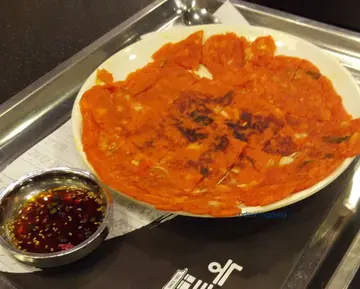 牛肋骨我就没有试了不过尝了几口汤底和蛋花蛋花很滑 汤底也是预期中的清甜:)在汤类中 是一个不错的选择啊泡菜煎饼(58)这个韩式小食我一直都想试这天终于得偿所愿一大块的煎饼 其实有如中式的煎薄饼一样不过面粉变为泡菜馅料的橙红色而且还能吃到一块块的泡菜在薄饼里面呢薄薄的煎饼略带香脆但又吃到面粉的烟韧感 加上带点咸味的豉油沾著吃是一客值得推介的小食呢!