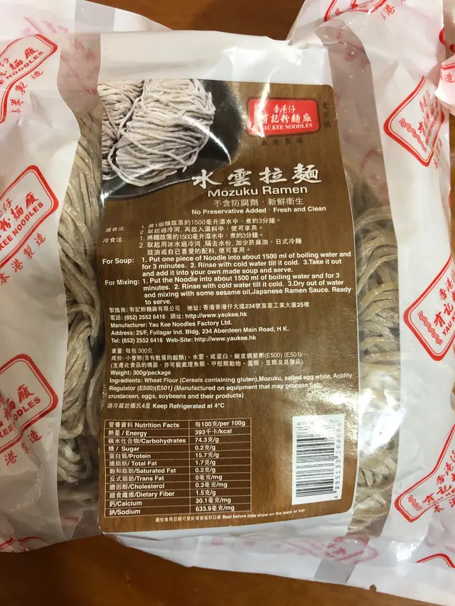 有記在香港的粉面廠之中算係有唔少零售分店,本次光顧這家位於油麻地地鐵站附近。有為送禮而設的禮盒裝,硬盒包裝精美,但價錢亦會較貴。只就蝦子麵已經有幾個不同的級數及價錢,這次我買了最貴的一種,綠色包裝的來嘗試。綠色包裝袋有密實封條,可以重新封閉以存氣保鮮,這點做得很好也有實質需要。但裏面再分兩小個透明膠袋各盛載着五個麵餅,就有點不環保、過份包裝之嫌。是我見過香港云云粉面廠出品製作之中個頭最小的一款麵餅,我認為要吃飽一餐最低消費兩個麵餅。聽店員教路放落滾水中一淥散就馬上撈起,不用放任何調味。麵的香味一般,但勝在入口口感滑,咬落有爽勁,是典型的高級粉麵製作。湯的蝦子鹹鮮香也十分之惹味,全無鹼水味道。…查看更多