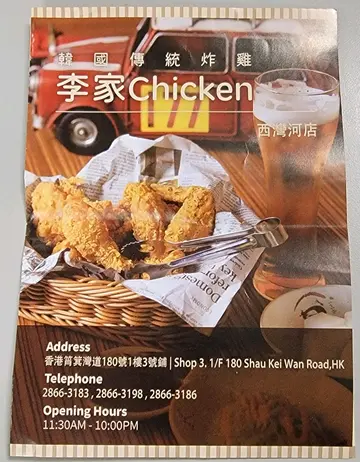 李家地址:西湾河太康街1号丽湾大厦地下L号舖之前黎讲西湾河李家依到食过,个时仲有得堂食,估唔到短短两个月之后已经暂时停左堂食,但作为fans都会支持佢,所以今日都叫左李家外卖去酒店食。点餐:1)仁蒜蓉蜂蜜炸鸡$1282) 口鱼饼汤 $128蒜蓉蜂蜜炸鸡好好味,炸鸡—向都系我既至爱,所以黎亲韩式餐厅食嘢,炸鸡我都系必点既,半只份量唔多但一 个人都够食,而且佢仲会配一支无糖可乐,非常贴心。而鱼饼汤用料好足,同好够味非常好饮。餐厅评分味道⭐⭐⭐⭐环境⭐⭐⭐⭐服务⭐⭐⭐⭐卫生 ⭐⭐⭐⭐抵食⭐⭐⭐⭐…查看更多