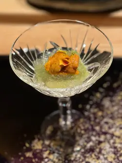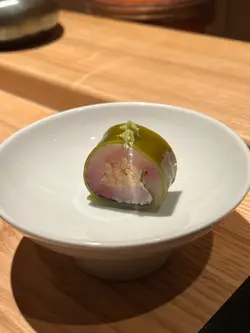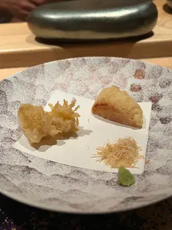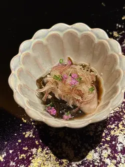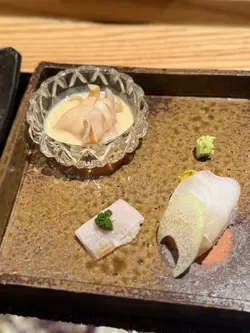 到上環一間充滿日本氣息高級料理吃omakase,餐廳都好衛生,洗手間全部都用全自動的,而室內有一些綠色植物裝修襯托着顯得特別雅致,像置身在小庭園。—*先付*—1. 京都賀茂京都茄子配北海道馬糞海膽,洋蔥味特別,好有層次。 —*前菜* —1. 兵庫縣夢追星生蠔配水云藻,清新爽口,好開胃。 —*刺身*—1.平目魚、平目魚裙邊及愛知嬡象拔蚌用象拔蚌膽汁醬汁增鮮味突出更加帶出鮮甜。2.一本池魚的手工調味,配蔥粒講究肉質完整,而且每條都是人手釣上來的,據師傅講是為了保持肉質彈性。—*掦物*—北海道粟米、烏魚子配新鮮黑松露,香氣濃郁。 —*燒物*—伊勢龍蝦配無花果、青瓜,師傅用了五成熟來煮龍蝦保持鮮甜清新味道。— *壽司* — 1. 縞深魚:魚肉新鮮口感細膩,帶有自然甜味。2. 新鮮北寄貝:質感爽脆,海味濃郁,令人回味。 3. 赤身:油脂適中味道濃厚鮮美,層次分明。 4. 秋刀魚配薑蔥:魚脂香四溢,薑蔥提鮮,恰到好處。 5. 海膽魷魚:海膽鮮甜濃郁,配上魷魚爽口唔膩,好有驚喜。 6. 鯖魚:肉質結實,味道濃郁非常開胃。整體嚟講,壽司每款都保持新鮮,細膩同層次分明,夠哂正宗。—* 煮物椀*—筋子(鮭魚卵) — *吸物*— 鮑魚魷魚味噌湯 — *甜品* — 綠茶蕨餅配提子,清新甜蜜完美結尾。 …查看更多