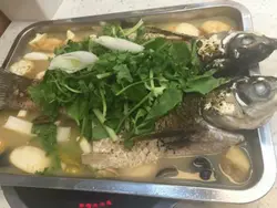 88蚊一大条烤鱼,选择左草菇鱼汤,条鱼尚算新鲜,肉质结实,但成个汤味道偏淡,单靠草菇去调味根本唔够,可取既地方系条鱼加d菇已经令我地饱左。利宾纳加燱米,根本唔觉得佢地两样野系夹,仲要加d粟米真系更加奇怪,不过又系饱肚野,呢间店可以话系抵食,但唔觉得好食。
