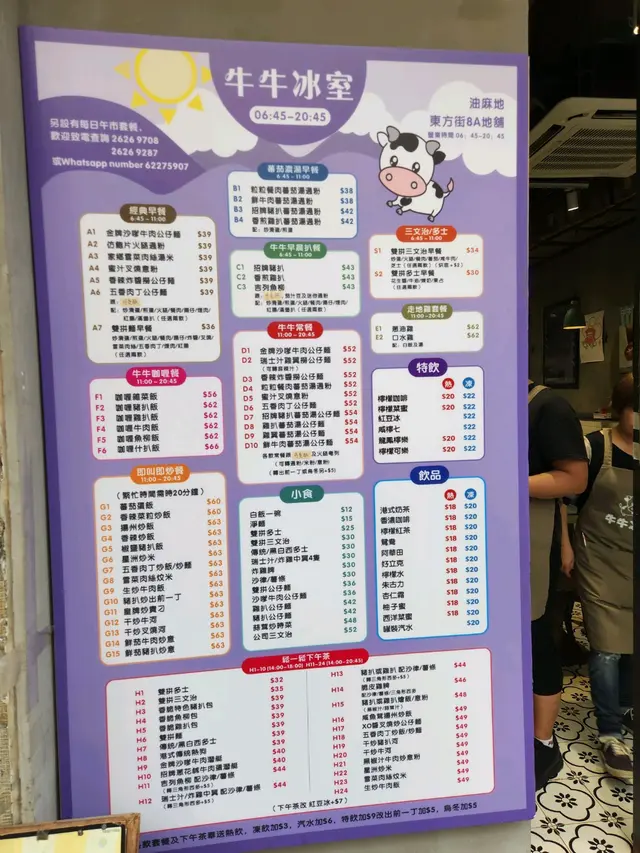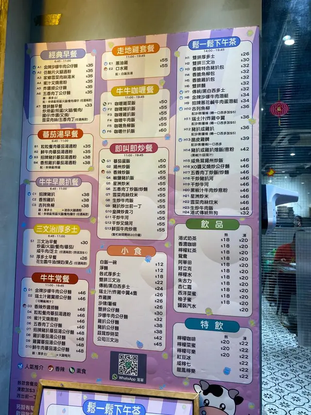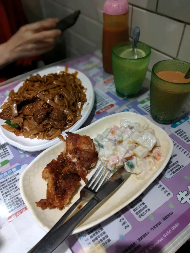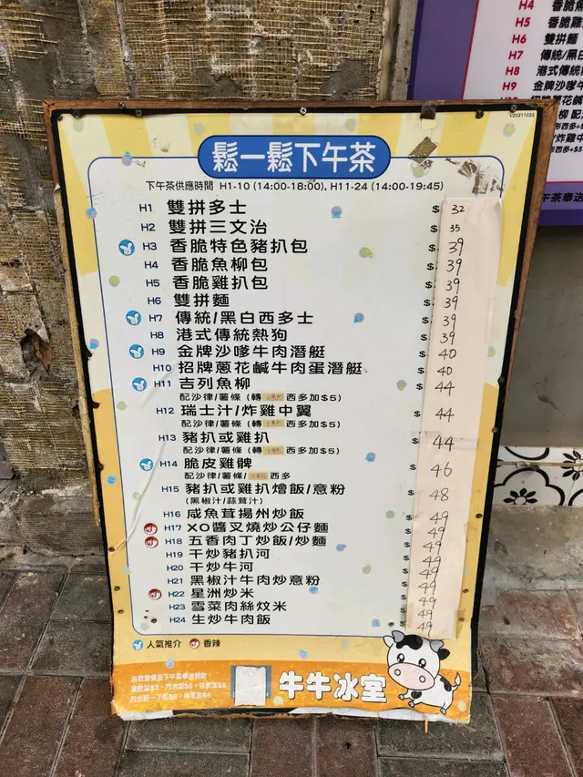 之前聽人講話油麻地有間牛牛冰室,佢地嘅下午茶又抵食又好味,特別係乾炒牛河、炸雞髀都好出色! 今日遠度而來,特別來試試佢哋嘅下午茶餐! 下午茶餐由下午2時至晚上7時45分供應 (H1-10號餐 由下午2時至下午6時停;H11-24號餐由下午2時至晚上7時45分停),下午茶餐牌共有24款選擇,小食炒嘢樣樣都有,平均價錢都是$3x至4x以內,在油尖旺區價錢嚟計,實屬好經濟!我們點了兩個下午茶餐,一個是港式傳統熱狗加熱奶茶,另外一個是乾炒牛河加凍奶茶! 由於牛牛餐牌太吸引,小妹就叫多隻炸雞髀想自肥
