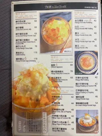 基本上所有甜品都系以芒果为主甜品外观吸引,令人有食欲虽然有少少贵,但装甜品的碗容量较大,加上有很多不同的配料,整体来说都不错整体而言,冰沙方面较差,因为冰沙有啲太粉,唔似冰沙
