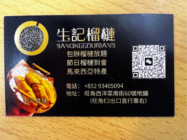 生記榴槤 (旺角) 网址: https://s.openrice.com/QrLS0VBiC00 地址: 香港旺角西洋菜南街60號地舖 电话: +852 93405094