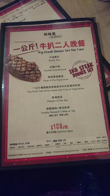 我敢说这里的牛扒是湾仔区内的天下第一大块!这牛扒屋因早前以「牛扒放题」作招来而声名大噪,可是被食客指服务不周,我决定来一试,为这店平反!周日晚上7时和友人专程来尝尝湾仔闻名已久的牛扒。应该是店主的男人为我们介绍了餐牌,我们点了“一公斤!牛扒餐”,食物好快就逐一上枱了。餐饮 - 我点了冻菜蜜,友人点了杂果宾治,心目中应该是橙橙红红的饮品,但出来像是冻清水加少许水果。两杯饮品大大杯,却淡淡的,没什么味道。餐汤 - 细细碗萝宋汤足料,好多菜,好味道!前菜 - 新鲜生菜沙律和香脆蒜蓉包,前菜有水准,为整个晚餐加分!小食 - 炸薯条够长够香脆,必需要趁热食啊!主菜 - 一公斤牛扒,一上枱就把我们吓一跳的超大份量,是一人一公斤,多得惊人!牛扒大约5成数,我倒是吃不惯这么生,每切一刀,大量血水渗出。味道还好,不太咸,但略嫌稍为多筋。友人却吃得津津有味…甜品 - 饭后来个云呢嗱雪糕清一清吃了一公斤牛扒的味蕾。我觉得服务方面是挺周到的,只见楼面只有两人为全部食客在奔走,服务热诚的!食物质素不错,还会再来,但下次一定不会再点一公斤牛扒了。查看更多