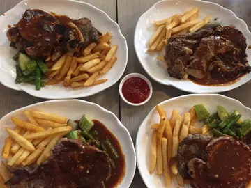 公司附近虽然有好多餐厅,但系返工要揾饭食嘅人都好多,今日去咗呢间食lunch。知道佢夜晚有个任食牛扒做 gimmick, 但系老实讲,脚踏实地食个lunch set仲好啦。午餐大概有六七款选择,因为佢夜晚做任食牛扒,所以大家都选择了食扒lunch😋😋set lunch 有餐汤罗宋汤,味道ok,内有椰菜,唔会太酸。左下主菜是$76 ,肉眼扒,size 份量好足够,叫咗七成熟,七成都唔会太硬,有牛味,以呢个价钱来讲,算系好OK ,只系𠮶边位有根,咬唔难。其他三个主菜系牛扒拼猪扒,有啲杂扒feel 牛扒也是一大块,猪扒一块(中型),以lunch 而言,分量十足,牛扒味道同肉眼扒其实差唔多,$$钱只需要$72,后悔叫肉眼扒set呢!配菜方面,是一大碟薯条,足够饱啦,而且有茄子粒丶翠玉瓜粒和豆角,肉肉肉有了中和作用,配搭都好食!美中不足系唔可以跟食客喜爱,把薯条转做饭或意粉,如果要食饭,就要加$10。最后有一杯餐饮,食得好饱:)查看更多