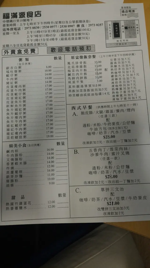 福滿源食店外賣中心 (中环) 网址: https://s.openrice.com/QrLS0wv4100 地址: 香港中環鐵行里10號地下 电话: +852 29730830