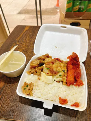 With the pandemic and all its restrictions, up and coming restaurants have geared towards take away. One that has become extremely popular is "Two Dishes One Rice". There are so many of them! And more opening as I type. Once found only among the working class, due to pandemic dining restrictions, many people of all walks of life are ordering from there. The concept is simple. They offer a choice of two mains and one serving or rice for a set price. And prices are very cheap. Majority under $40. Some even include a serving of Chinese soup. All of them are take away while some have a small dine in area.One such place is 老广味小排挡. Located in Wanchai, it's layout is like every other place offering this type of takeaway, I decided to venture and try one for the first time. Why this one? The food looked good and turn around seemed decent. The staff here was extremely nice! They were polite and friendly. Greeted everyone with a smile. Probably one of the most polite service I've ever had.Like many of these establishments, the set up is the same. The kitchen is in the back. And the front is several trays of cooked food. Always labelled in Chinese. I have yet to find one with English. But that's clearly ok because all you need to do is point.Menu is also in Chinese only. But basically it's a choice of two mains served with one serving of rice for $38. They also serve Hainan chicken rice and other dishes as well. But I was here for the two dishes one rice. Everything is served in a styrofoam container with partitions. The serving of rice was huge!I did reheat it when I got home. I'm always worried about food safety. The two dishes were braised fish tofu and deep fried pork chop. Yes, they look the same but we're not fine dining here. It taste ok. Not great but fairly decent. The pork chop was tender. It wasnt too salty. Portion was enough for boyfriend and me to share.First foray into the 2 Dishes 1 Rice. Will venture and try another stand next time.…查看更多
