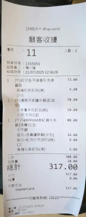 今次同两位同事去咗茶木食晏,叫咗几款招牌菜式,每样都相当有惊喜!今次同朋友去茶木食晏,最惊喜一定系个柯仔金不换奄列肉燥盖饭!上台时就见到铺满晒嘅柯仔,每粒都胀卜卜,咬落鲜甜多汁,完全冇沙,同金不换嘅香气夹到绝。奄列煎得啱啱好,外层微微焦香,入面仲保持到滑溜口感,捞埋个卤肉燥一齐食,咸香中带住海鲜嘅鲜味,层次丰富到不得了!同事叫嘅盐水鸡配菜饭都唔输蚀,鸡肉撕得幼细,配埋青瓜丝同特制酱汁,清新得嚟好开胃。至于个红烧牛肉面就更加系招牌之作,牛肉炆到淋而入味,汤底浓郁得嚟唔会太咸。追加嘅盐酥鸡同红油抄手都系水准之上,特别系红油抄手皮薄馅多,辣得过瘾!虽然价钱唔算平,但质素绝对对得住个价钱。茶木keep到咁高水准,难怪午市都咁旺场!查看更多