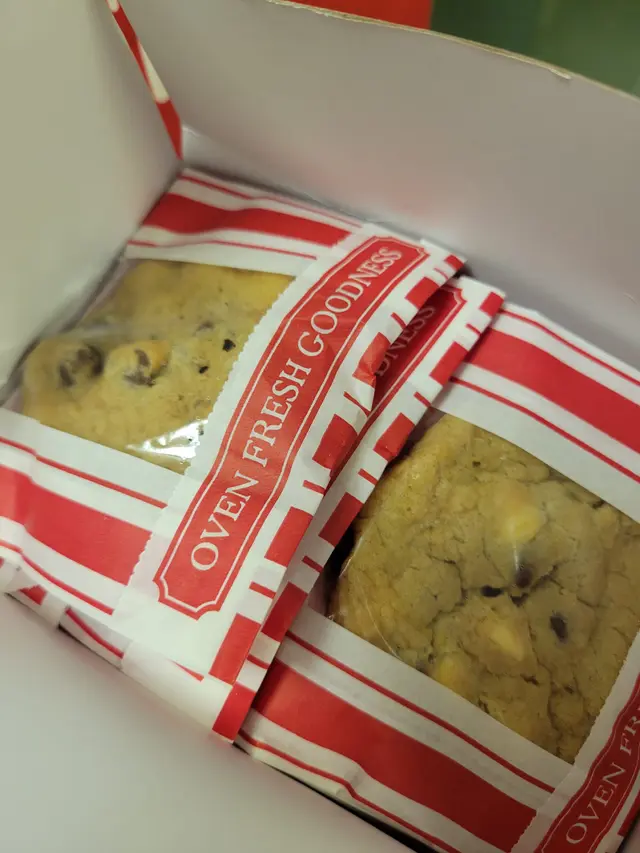 這裏的曲奇餅乾都是美國式的——柔軟,有嚼勁的,甜甜的巧克力曲奇餅的品種。 我最近喜歡一個甜甜的巧克力愛好者和牛奶巧克力/堅。 兩個都很好,如預期。 其他的種類也很多,我一定會接不時包括半甜巧克力,燕麥葡萄乾核桃和三層的巧克力查看更多