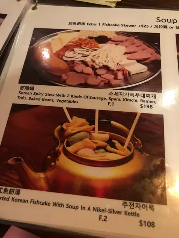 点埋个韩式芥末酱一流之后贪得意叫左依个鱼糕串串锅仔,佢有埋个杯比你倒啲鱼汤浸住啲串串鱼糕,鱼糕好食,但其实啲丸略嫌多粉实得滞唔弹牙,但想试下都值得一试,几特别之后两个人埋单折埋total 400, 依个价食咁多野又坐甘耐都值日山