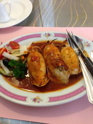 餐前先点了鱼翅忌廉鲍鱼汤,热呼呼的汤加足料的材料,简直是色香味俱全,浓而不腻!烧青口~整块青口都铺满了满满的蒜蓉,再加薯蓉打底,就连平时不怎吃蒜蓉的我,也忍不住要为了这块青口而破戒!烧汁羊脾,烧牛仔柳~轮到我至爱的羊脾,order了6成熟,上桌时真的恰到好处,配上薄荷和芥茉酱,简直把羊扒的鲜味发挥得淋漓尽至,再浅尝一口红酒,绝对是人生一大乐事!至于烧牛柳,真可惜,由于自己不吃牛,只能望著旁边的同事吃得津津有味,只看见他们手起刀落的一切,肉质应该烟烟靭靭,不到一会,整碟牛柳已被他们吃光,问他们味道如何,只回应了一句"正"!招牌菜烧鸡酿饭,之前在某间餐厅已试过,已心知烧鸡肉质应该会比较"鞋",但令我惊喜的事,不仅烧鸡肉质滑嫩,里面的饭味道更是恰到好处!西班牙海鲜煲~本想order海鲜汤饭,但餐牌没有,老板娘贴心的建议这个海鲜煲 白饭,海鲜煲海鲜足料,汤底浓郁,真的令我知什么叫"吃过返寻味"的滋味!三色烧扇贝~何谓三色,就是有三款用芝士,蒜蓉,烧汁来烧,热腾腾的芝士蒲满整只扇贝,完全没有"溜"的感觉,烧汁扇贝是用日本烧汁,大玩中日cosplay,新鲜感已足以给10个赞,浓郁的蒜蓉配上大大件扇贝,鲜味加蒜蓉之味道在口腔滚存,这时再配一口白酒,扇贝的余香简直令人食指大动!最后再加一底鸡蛋布甸,滑滑的蛋香,恰到好处的甜味,真令我舍不得要向这顿美味的晚餐划上完美的句号!想不到澳门还有如此出色的葡国餐,无论服务与味道,真想像不到可以用满分来形容,最后埋单,11人平均每人不到$200元,物超所值,建议大家先订位啊,未到八点已座无虚席呢!