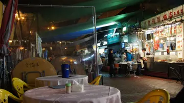 平时晚上搭巴士回家时,首站停在富健花园,巴士站旁边正有几间餐厅﹑饭店,这一带早上至下午是水静河飞,但到晚市时候,就变得热闹非常了。