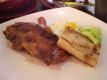 囝囝有比赛,大清早便要往屯门跑,水都无一滴下肚,就趁有少许时间,来一个快餐好了.十年前曾在附近居住一段日子,此店记忆所及已经存在,多年不变,总有一班捧场客吧!早餐同一般茶餐厅有少许出入,先选了牛扒配火腿,蛋及餐包,粟米火腿通粉,圆肉红枣茶.牛扒配火腿,蛋及餐包 : 牛扒是腌得有些微过火,但不过分,蒜汁反而味不够浓郁,伴碟有几片椰菜,算是下了点心思,餐包另有一小盒牛油,整体来说是有心的一碟.粟米火腿通粉 : 份量不少,不过只是单指通粉而言,火腿丝只得几条,通粉是渌得过火,太腍了,要求也不能多,犹幸够热辣辣,并非求其淋点汤上面就算.圆肉红枣茶 : 真是第一次在早餐时饮,味道是甜过了头,但够清润,呷一口,干涸的喉咙亦即时有点湿润的感觉.廿几蚊,有扒有圆肉茶,有新意个人真系几喜欢.Read More