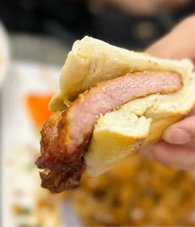 再尼,猪扒,佢吾系簿簿地一块,相反,厚身猪,香,煎得好好,无油益味大大口,咬落去,佢可以话系一个脆猪,吾口,有时啲猪扒系炸到呢,口,面包就会烘到干哂。呢间,得。包面脆,脆完之后,佢俾返面包嘅柔软你,好让你配合返猪扒嘅出埸。