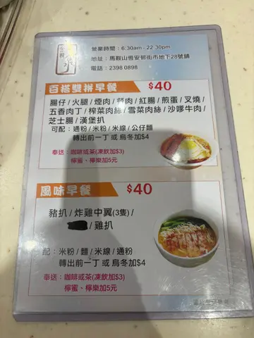 继续马鞍山觅食,今次早餐就试恒安街市入面茶记,环境尚可加上装修都算企理,最可取就系灯光充足冷气够晒,大热天时冷气真系唔少得!服务就茶记质素,我觉得又唔好抱咩大要求,等于食鱼蛋粉你都唔会期望有咩一流服务,实事求是啦…不过价钱方面呢真系偏贵少少啊,所以早上都真系唔算多人….早餐选择就真系唔算好多价钱话贵又唔算,但话平就真系唔算,始终系街市既茶记,都系附近屋邨同开工既人来食,所以有比较之下真系未必会来食。但胜在坐得都几舒服,冷气足