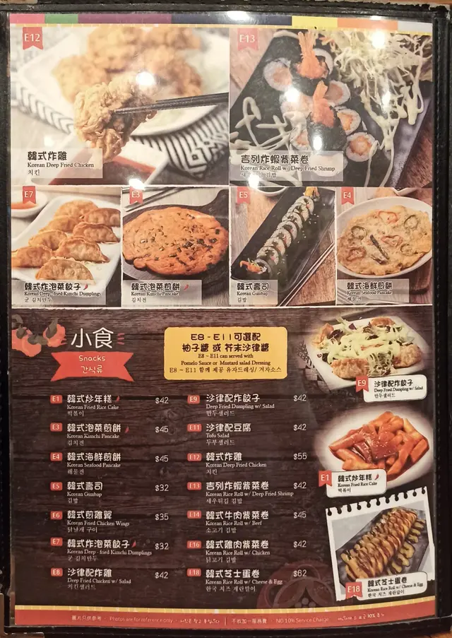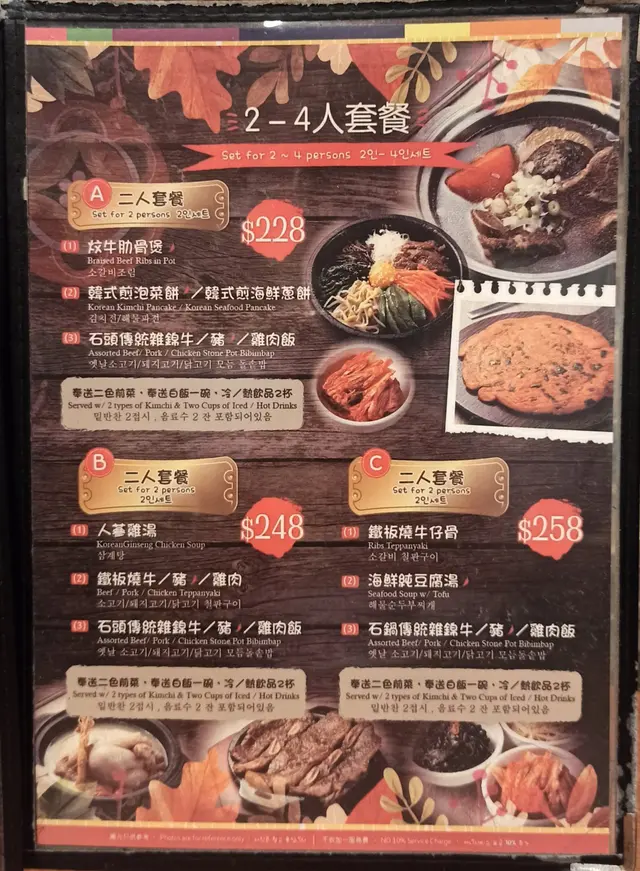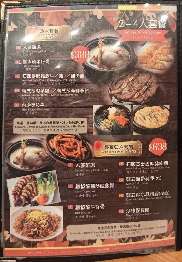 好耐无帮衬过呢间韩式小店了,应该都有六七年甚至更耐。见到个二人套餐A有炆牛肋骨煲,就叫二人套餐A($228)啦。有三个主食,两款前菜,一碗白饭,两杯餐饮。前菜系韩式泡菜同凉伴海带,餐饮要咗冻蜂蜜苹果茶同冻蜂蜜红枣茶。炆牛肋骨煲,上枱个煲入面啲汤仲滚紧,有4旧厚切牛肋骨,一旧红萝卜,一件冬菇。牛肋骨炆得好软腍,兼且十分入味,牛味仍保持到。汤底咸咸甜甜,加落白饭变汤饭,最后啲汤饮哂。韩式煎海鲜葱饼,微微香脆,饼底口感软糯,粉浆唔糊口,海鲜配料及葱唔算好多,味道正常。石头传统杂锦猪肉饭,好耐无食石头饭了,石锅超热,所以锅底有少量饭焦。除咗猪肉片,仲有大量配菜(翠肉瓜、紫菜、芽菜、菠菜、红萝卜丝、白萝卜丝、鸡蛋),加埋前菜嘅泡菜,再唧埋石头饭嘅灵魂「甜辣酱」,将所有嘢捞呀捞呀捞,口感十分丰富,多重味道层次。PS:没有加一服务费。收现金、八达通、支付宝,满$300接受信用卡。