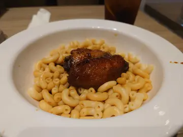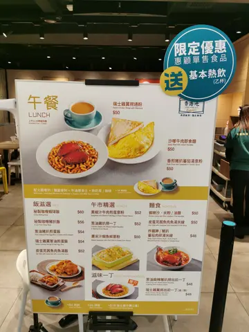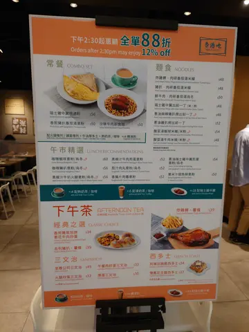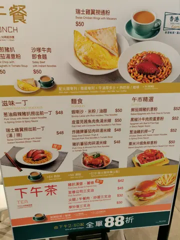 It was a public holiday and I couldn't find a place to eat as every where was packed except for this place. A main stream fast food style cha chan teng.Menu is in English and Chinese. There is no 10% service charge. You order by scanning the QR code which is easy to use. The only thing that I didn't like was there were two QR codes, a larger one and a smaller one for an app download. This had me a bit confused at first as my phone camera kept using the smaller one until I covered my hand.They had an afternoon tea menu. Lunch menu is also available with a discount of 12% after 2:30 pm.I ordered the Swiss Chicken Wings with Macaroni combo set ($50) which includes a hot drink, toast and omelette.I had an ice lemon tea. This just tasted like Nestle ice tea with slices of lemon in it.Half a buttered toast was provided. It was fine with a spread of butter. For the omelette, you get a choice of ham or mushroom. I chose ham and small thin slices were stuffed between the super thin egg. The egg itself was over cooked so tasted rubbery.The wings were dark in color but had not much flavor. The macaroni was soft and didn't really take up the soy sauce. The soy sauce itself didn't have a lot of flavor either.Price wasn't expensive but it wasn't that good, either. No wonder it was not busy at all.…查看更多