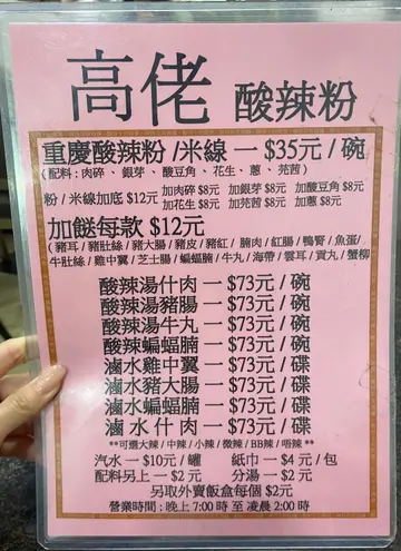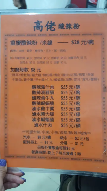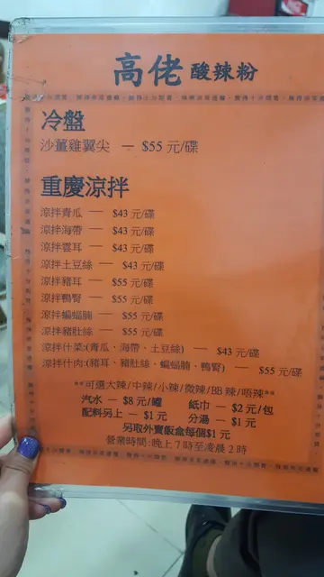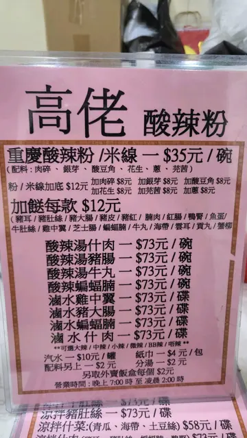 朋友新居入伙,也是住东涌,去探望前竟然话想食酸辣粉,所以我就推介去呢一间高佬酸辣粉。佢个价钱都系比较亲民,唔会好贵。我就点左一碗微辣嘅酸辣粉同两个𩠌。一个系蝙蝠肉腩,另一个系自家制嘅粟米猪肉饺子🥟。跟住加多个小食海带其实佢个蝙蝠肉腩唔系蝙蝠🦇🤣佢唔系野味嚟㗎,其实系猪肉,只不过佢个型状会有少少似蝙蝠,所以先有咁嘅名。但系我自己觉得似黑蝴蝶🦋🤣多,佢个口感食落去比较爽口,调味方面都唔错。值得一赞嘅系佢嘅饺子真系好大只,里面好多馅,佢嘅粟米粒好甜,加埋猪肉好好食😋。如果大家都钟意食饺子嘅人我建议你地试下,系好食😋推荐面方面佢系比较淋身,食落去都会比较Q弹,佢个微辣汤底真系少少辣所以如果唔食得辣可以一试。…查看更多