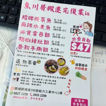 继续观塘午餐推介今日食鱼川居值得推介抵食好食食川茶的一家快餐店不是小炒但午餐一流本人觉得1245前离座有8折,2点得好似再多啲折扣但唔系好记得大家去食时可以睇睇,大大只采写得好清楚但唔理有无折扣,本人都觉得呢间店好抵食先讲讲龙虾汤面我地一行4人连续食左两日第一日同事食唔到龙虾汤所以第二日再去所以先讲讲个龙虾🦞汤完全就系龙虾熬嘅汤🤤好鲜,好浓,好香性价比高又足料,值得一试另外我地叫了一个酸菜鱼米线好多鱼,铺满成个碗,捉料,又酸又辣🤤🤤一流美中不足既系舖头可能无窗,地下成日都好滑⋯⋯行系上黎有少少危险但食物质素同价钱系性价比非常高大家系观塘唔知食咩既朋友可以去试试👍🏼推荐👍🏼🫡
