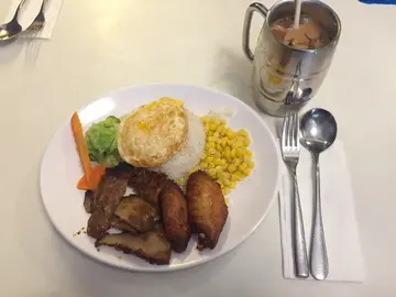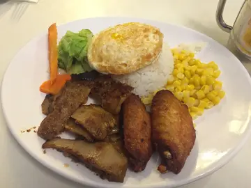 下午茶选择了泰式猪颈肉鸡中翼饭$46 冻饮+$3猪颈肉和鸡中翼都好嫩除了份量十足的主菜,配菜也不少玉米也不客气的给很多