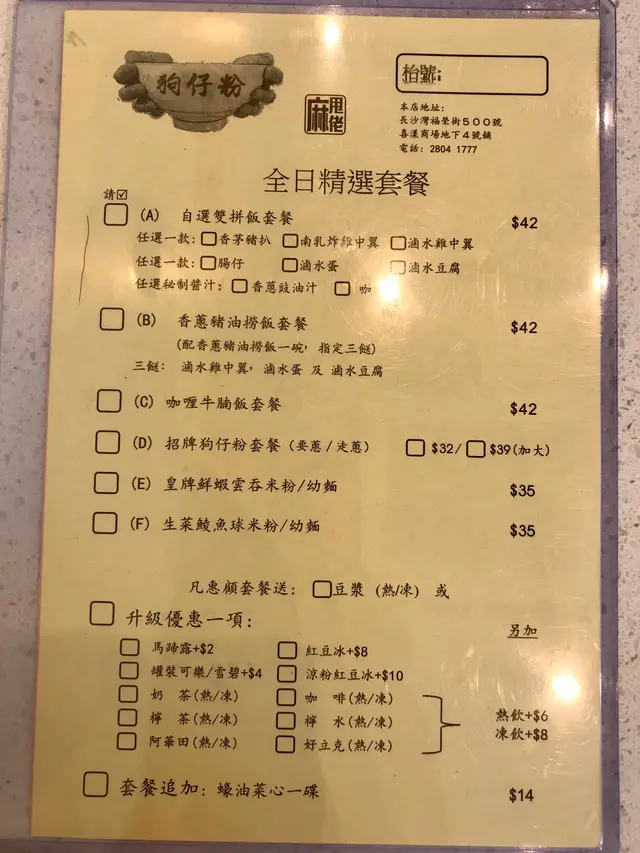 一個人想在15分鐘內完成晚餐, 除了燒賣魚蛋牛肉 ,可以有什麼選擇呢…… 終於發現長沙灣這間小店。今晚選了狗仔粉,湯底香,充滿細蝦米乾,內有油渣,上面灑上葱粒,在桌上可以任加菜脯,還有辣的菜譜。還有很多小食,例如碗仔翅,生菜魚肉,爆汁肉飽,魯水雞蛋,雞翼……也有多款糖水…… 套餐再加豆漿都係$30...查看更多