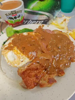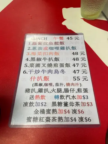 喺熟食中心随便是但拣一间,见呢间多人食嘅就坐底左。午餐叫咗个黑椒汁什扒饭同热奶茶。对熟食中心冇乜要求,但今次真系有啲觉得有d 难食。个黑椒汁完全唔似黑椒汁,只系个有少少味嘅有色芡汁,冇任何黑椒应有嘅香辣。猪扒算系正常,但油多得滞,流到成碟都系。鸡扒嘅鸡皮煎得几香脆,可惜鸡肉雪藏味非常浓。最好食嘅反而系最基本嘅火腿、肠仔同煎鸡蛋,至少系预期之中嘅味道😅。个饭有啲煮糊咗嘅感觉,口感唔太好。唯一要赞嘅系,有几条生菜,叫做加返少少清新感。杯热奶茶系正常发挥,茶味同奶味都平衡嘅。总括来讲,味道唔ok,份量系足嘅,只为饱肚嘅系可以嘅。…查看更多