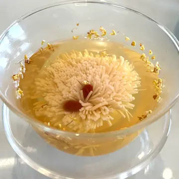 黄金百花蟹拑是十分金黄、饱满、香脆又鲜美的一款美食,实在令人很难忍口。起初为翌日献诗扬言只吃一口,后来也忍不住整件吃光;不止如此,席间有小朋友不吃炸物,看到台面多出的一只,那刻也万分心动呢! 还好最后也有朋友帮忙清货,不然暴殄天物还真令人心痛!是次新郎是围村人,不得不以传统的花胶竹笙鸡丝翅宴客。虽然这翅汤并没有用上很大量鱼翅,反而尽量以花胶、竹笙、鸡丝等食材衬出鲜味,味道并不俗,但意识上始终是不太环保。我真的很长气,将来再有朋友设宴摆酒,真的希望做到走翅,好吗?由于菜式份量很足,美味之下大家都又尽量吃光,再去到