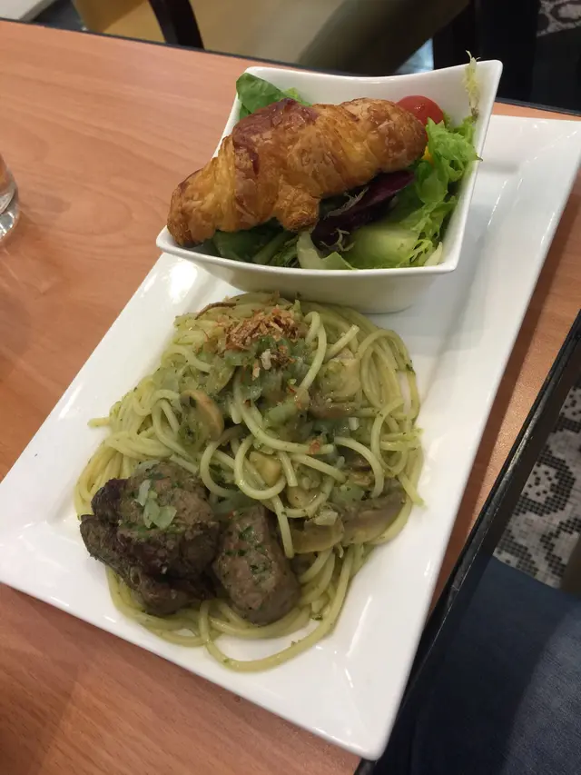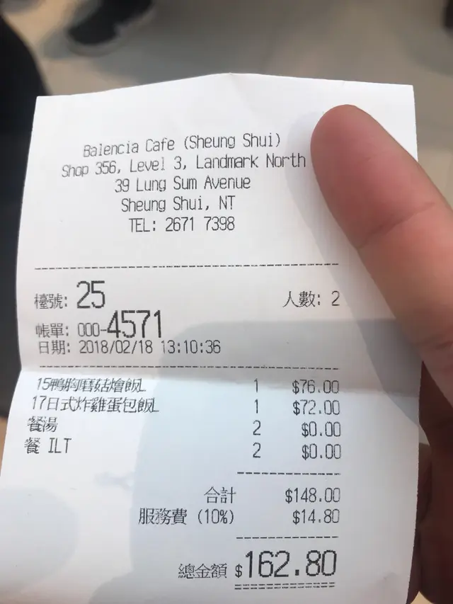 HK Munchies!Decided to go to Cafe Balencia in Landmark North mall (Sheung Shui) for afternoon tea today, I must say I was very disappointed at both the good and service.The cafe wasn't packed.and we were able to be immediately seated.Looking through the tea time menu there was a wide range of choices available, ranging from Japanese omelet rice to burgers and pastas.The staff kept asking us what we wanted to order and thus we decided to go for the safe bet and ordered a 'All day breakfast' plus a 'Fish n Chips'. Surely they can't screw that up, right?After waiting for 10 minutes our drinks still haven't arrived, it was just a ice lemon tea and a ice coffee. Trying to get the staffs attention was futile as they all seemed to be day dreaming or just in their own little world. After a further 5 minutes of trying to get their attention I got up from my seat and walked to them instead to chase up on the drinks.Finally the food and drinks arrived and the waitress just dropped it on the table with 1/3 of the plate hanging off the side of the table and walked off.... At first glance the food seemed acceptable but things changed when I took the first bite.Firstly theres the all day breakfast, the brand were cold and so was the croissant and the smoked salmon was dry as if it's been left out in the open for some time.As for the fish n chips, the fish was golden brown and the meat wasn't too dry. BUT it was bland and tasteless to the point where I wondered if they actually seasoned it at all. The fries were equally disappointing, no seasoning at all and they were cold and dry. I had my suspicions that the fries have been left out for a while because you'd get better fries in McDonald's.In regards to the pumpkin hash browns it wasn't anything exciting but wasn't a total failure either.Overall I was quite disappointed with both the food and service (they even charged a 10% service charge when there was no service from them).Not somewhere I'm likely to visit again.…查看更多