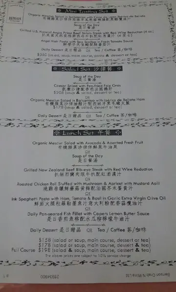 久唔久都会唻Benson食晏,感觉整体食物质素中规中矩,但时刻保持一贯水准。$158/set lunch一般为三选一,扒,煎鱼,鸡卷或意粉面等.... 配以沙律或餐汤,面包,甜品或餐饮,如餐饮甜品等等样样都要就要再另加钱$20。扒类:中规中矩,唔系特别出色,肉质一般,有肉味,冇根,配汁亦系一般烧汁之类,份量则足够。煎鱼类:鱼扒不时会转种类,煎鱼较为出色,外脆内软,肉质软滑。配菜南瓜薯蓉尤其好味!鸡卷:内卷有菇,南瓜等,外皮煎得金香,肉质软滑,好味!特别推介餐前面包,够热够香脆,尤其个芝士包,好味!餐饮绝对要试试佢哋嘅热咖啡,质地够厚,味够香浓,赞!甜品:分别试过芝士蛋糕及姜味蛋糕,一般蛋糕水准,冇咩特别,但味道都ok。整体而言,食物水准中规中矩,称唔上系咩法国菜,一般西餐还可,价钱中中上,闲唻一试无妨。…查看更多
