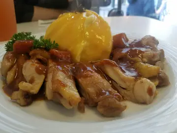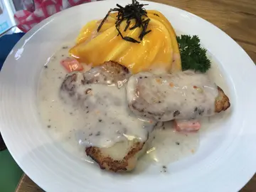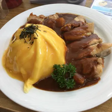 非常有心嘅小店,大家一定要支持! 鲗鱼涌地铁站过对面马路 ,太古坊范围 ,大家都知道𠮶度食店林立。有好多好嘢食,其中有一间小餐厅喺角落头, 知道佢主打蛋包饭, 但一直都冇去试到。 今次见下午茶时间,人少少唔迫, 我就去试一试 。入到去店入面, 店面的确好细 ,全店只有两位员工 同两张枱 。餐牌非常简单,只有四种选择 :其实只系得一种就系蛋包饭 …但系有两款汁可以拣: 自制咖哩汁或者系黑松露忌廉汁,同埋四款嘅配菜 。落咗单就畀咗钱先, 等咗十分钟到, 其实都算几耐… 食物送到喇 。卖相非常之精致, 睇得出系有心机排嘅。 扭纹蛋包饭的确整得好靓。 黑松露忌廉汁亦的确好香 。鸡扒就一般般 。蛋包饭配忌廉汁十分十分好食 ,一啖饭加一啖汁好快就食晒。 汁嘅份量一开始以为太多 ,最后竟然系啱啱好!睇店嘅装修都可以知道呢间餐厅 系好用心经营嘅, 而且都好细心咁准备咗厕纸畀客人。 最后店员哥哥仲送咗一份泡芙畀我食 ,十分窝心大家一定要支持!