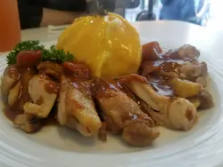 所以就入左去。午餐有三款,猪扒鸡扒同杂菜。我就拣左鸡扒,另外可以加12蚊配餐汤同野饮。蛋包饭卖相非常吸引